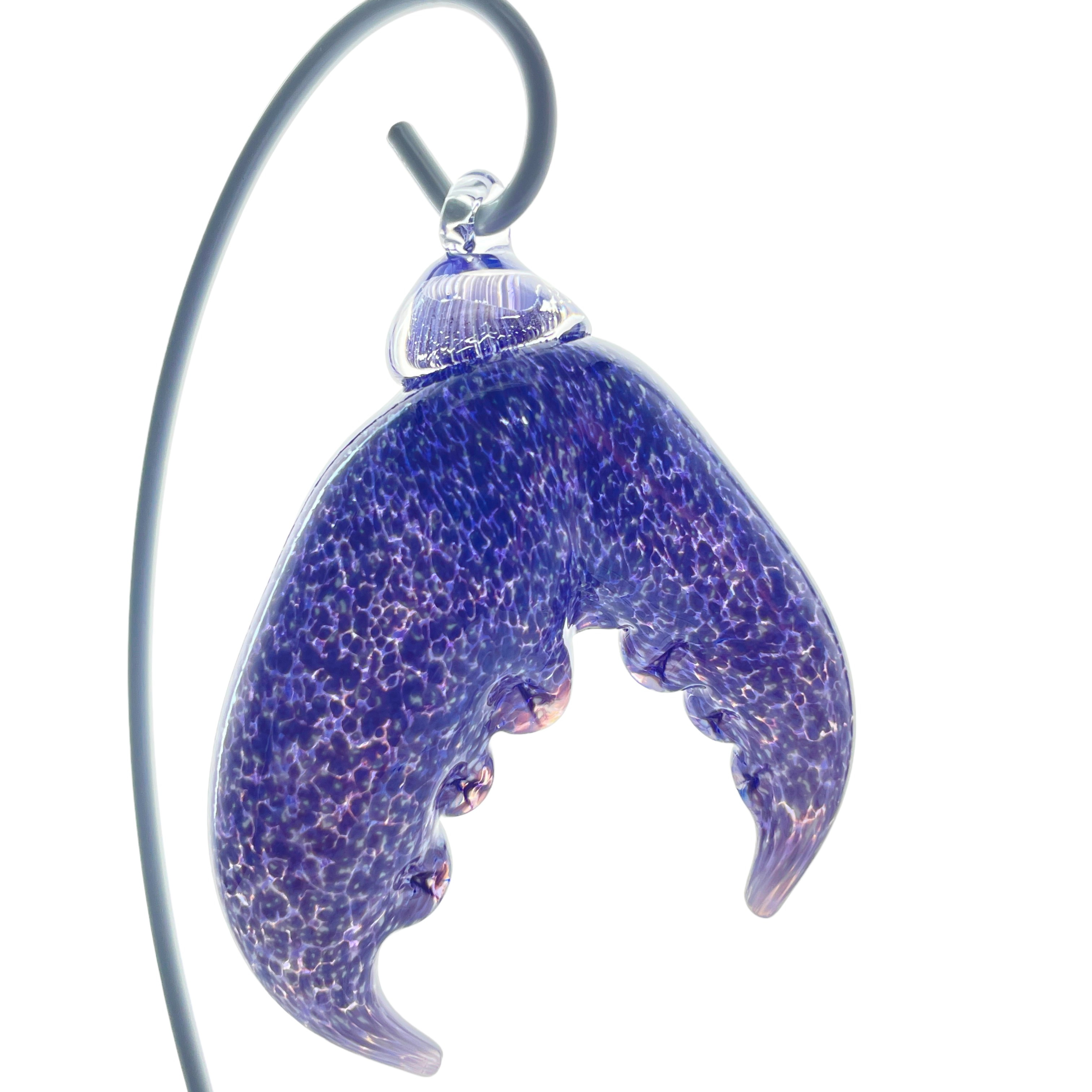 Why not, a purple speckled one! This hand blown and sculpted crab claw makes an unusual hanging decoration. Why not add them to a seaside scene or collect several and make a salty chandalier.