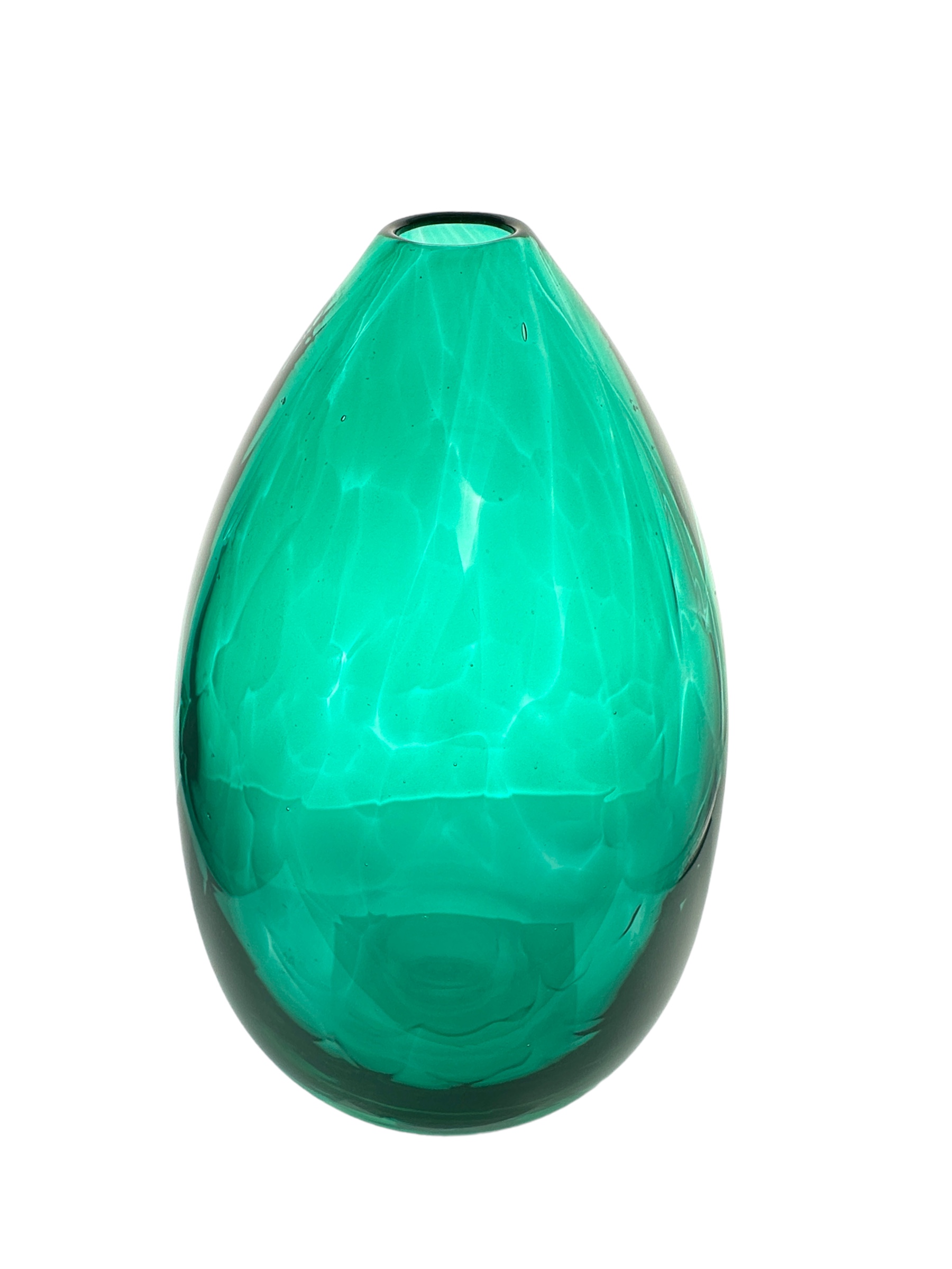 Glowing in jewel green, this heavy teardrop vase incorporates a beautiful patterned effect, that appears like overlapping confetti, creating strokes of light and dark across the piece.