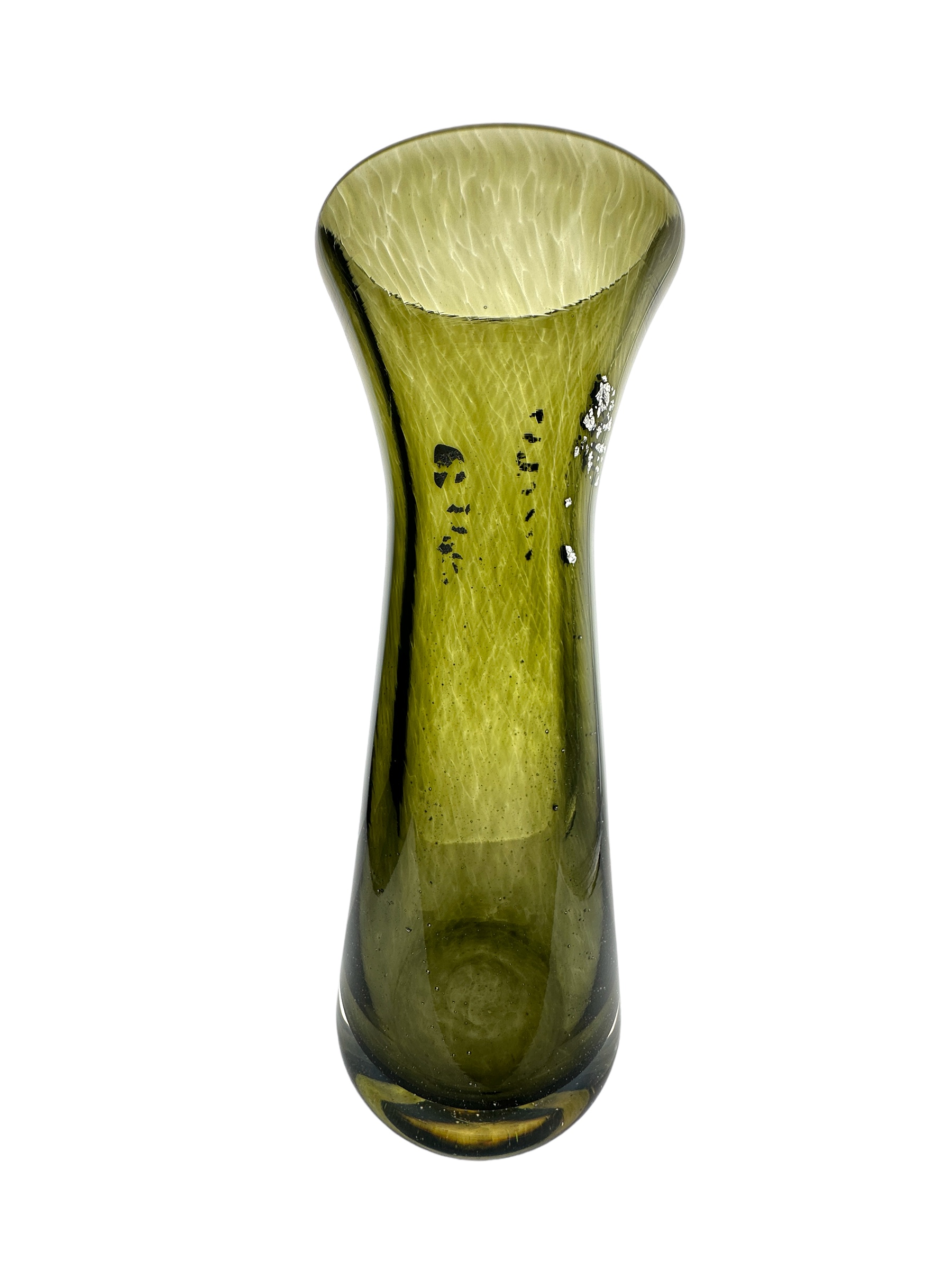 This grey/green vase has small silver leaf spatters that add interest and a hint of sparkle to the piece.